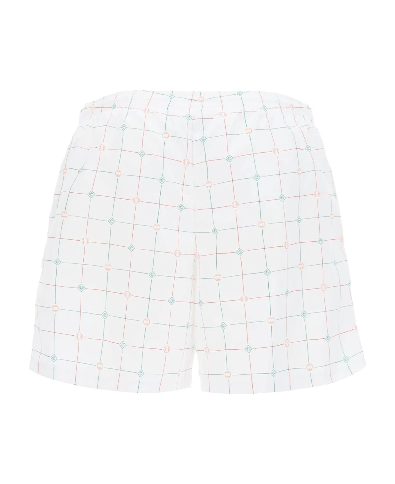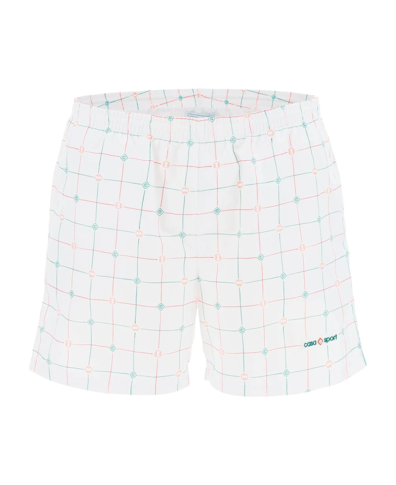 Casablanca swim trunks made from Tennis Check print technical fabric. They feature an elasticated waistband with inner drawstring, side on-seam pockets, and a logo applique at the left thigh. Comfortable inner briefs in stretch mesh.