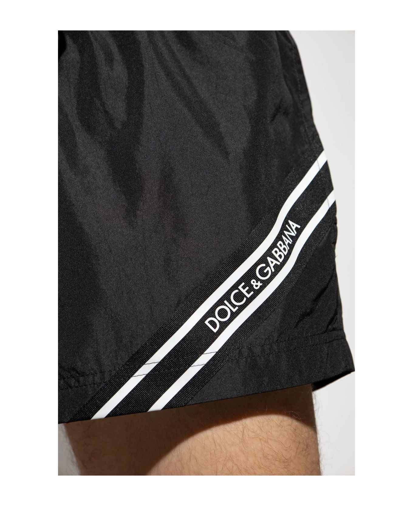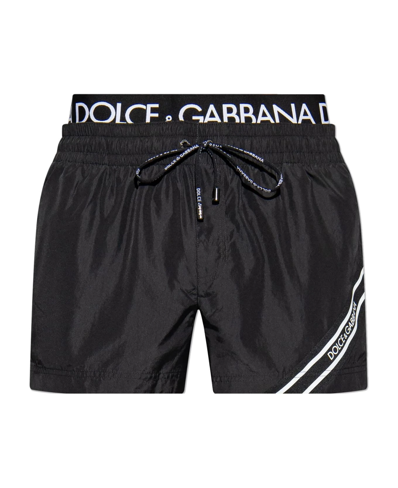 Black shorts from Dolce & Gabbana. This pair features an elastic black waistband with a white logo as well as two slip pockets and one zip pocket.