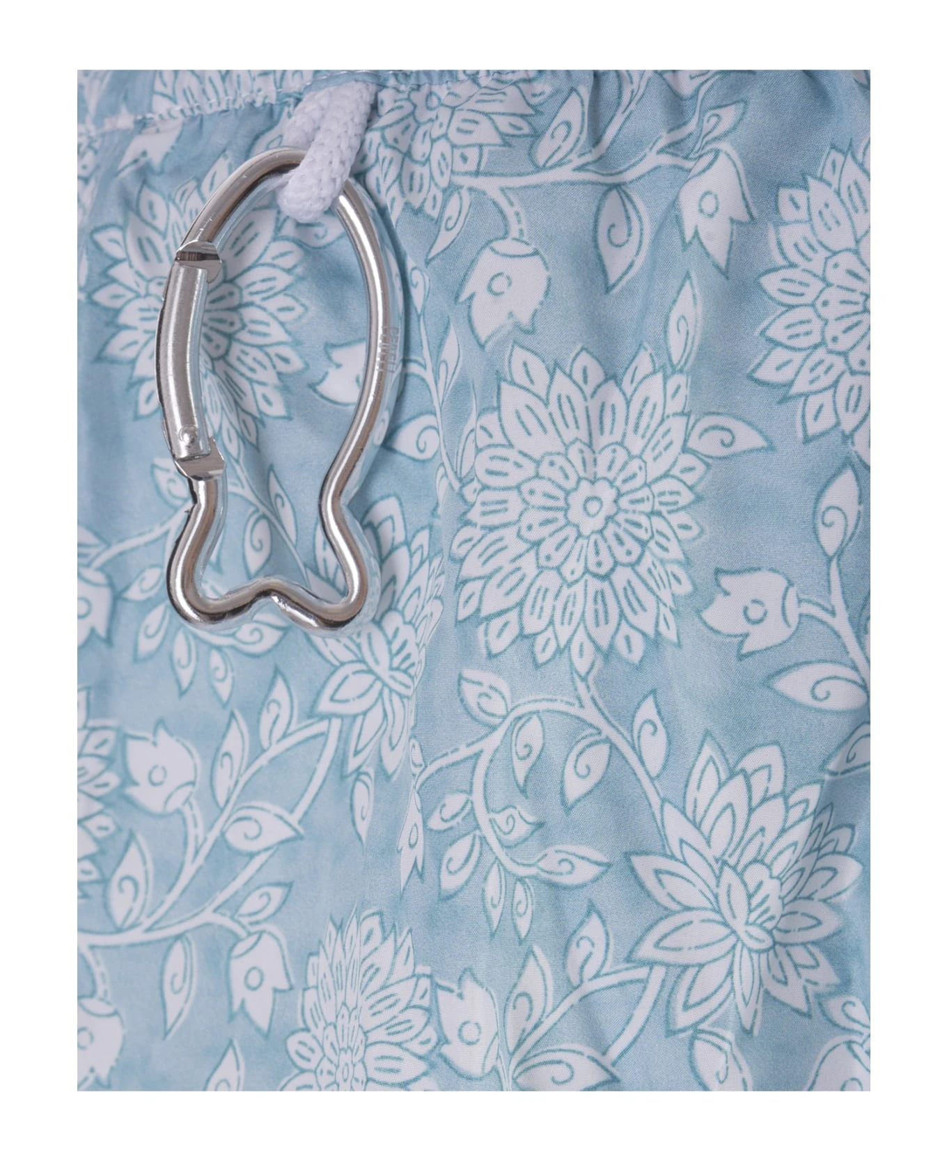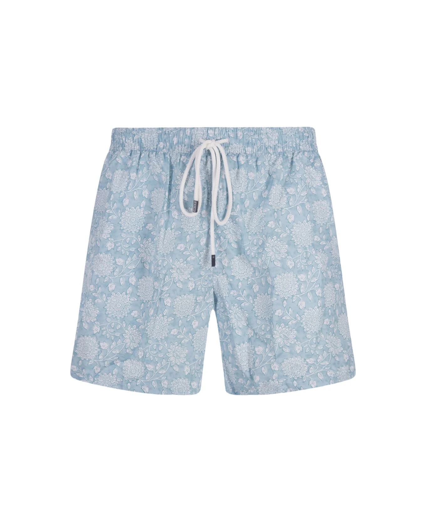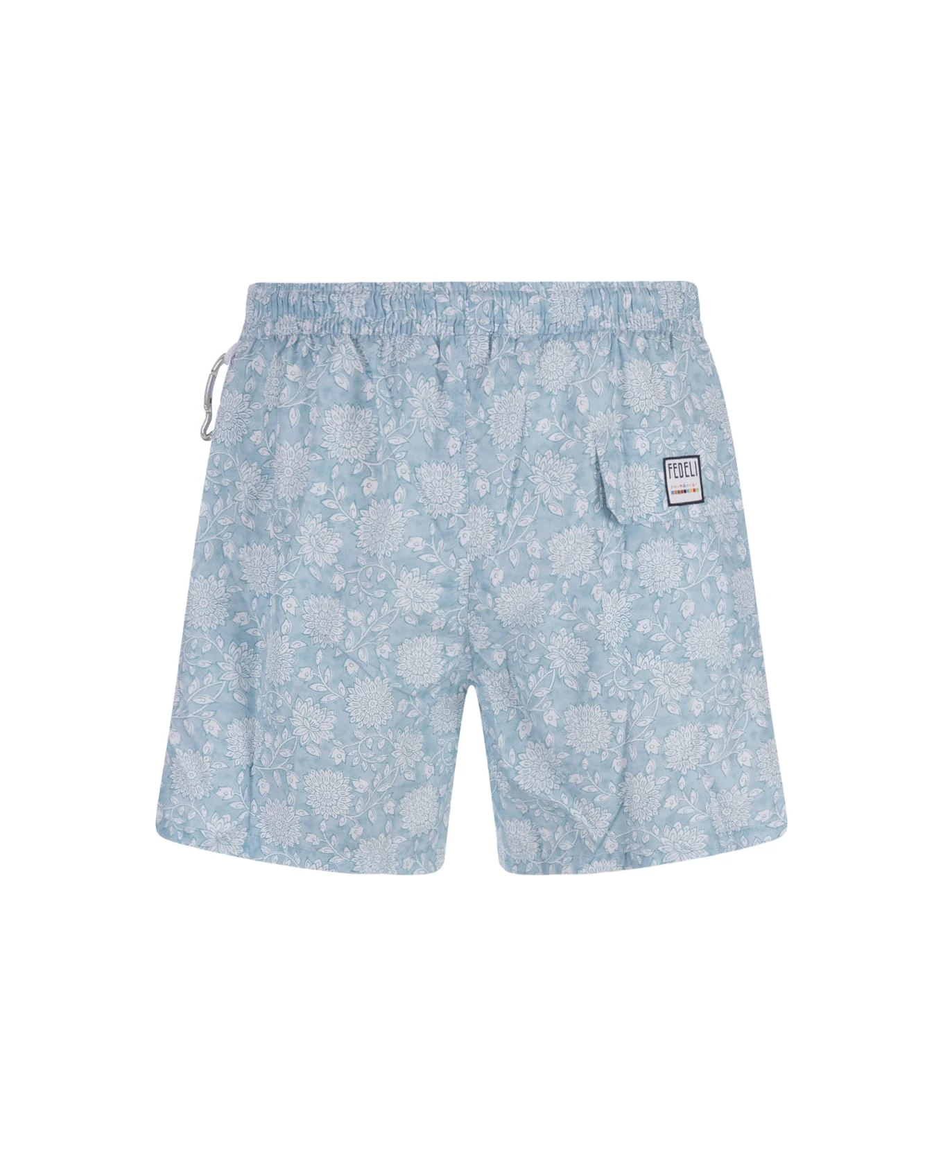 Fedeli swim shorts made of light blue technical fabric with all-over floral pattern. The garment features an elasticated waistband with drawstring, side slash pockets, metal snap hook and a back pocket with flap and logo patch.