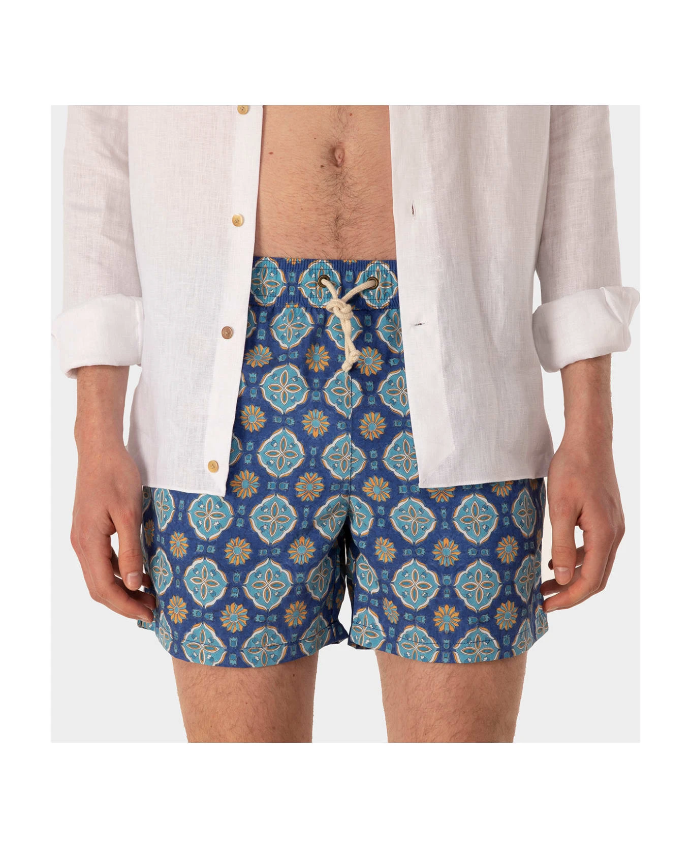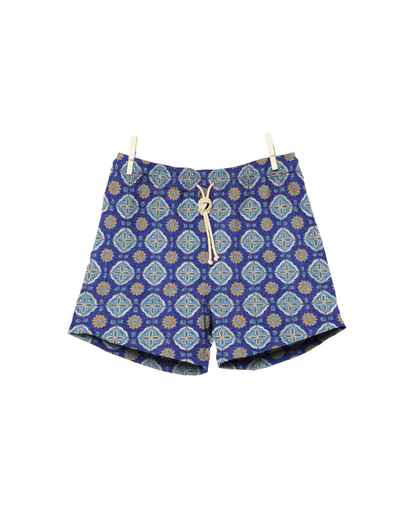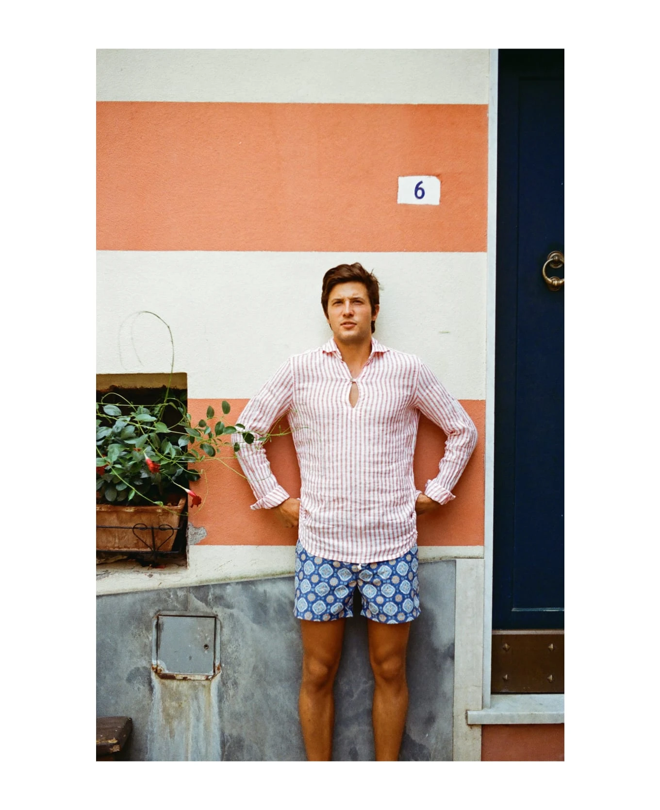 The classic swim shorts were redesigned for a more elegant, tailored look and a comfortable fit. Made from soft, brushed fabric that is quick-drying and has a distinctive cotton-feel. Tying-cord made from braided nautical rope in unbleached cotton. Pattern drawn by hand. Made in Italy.