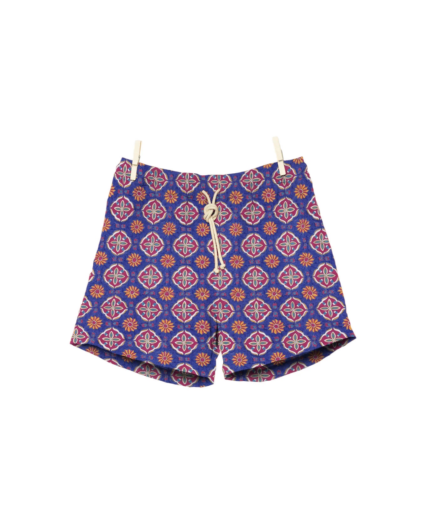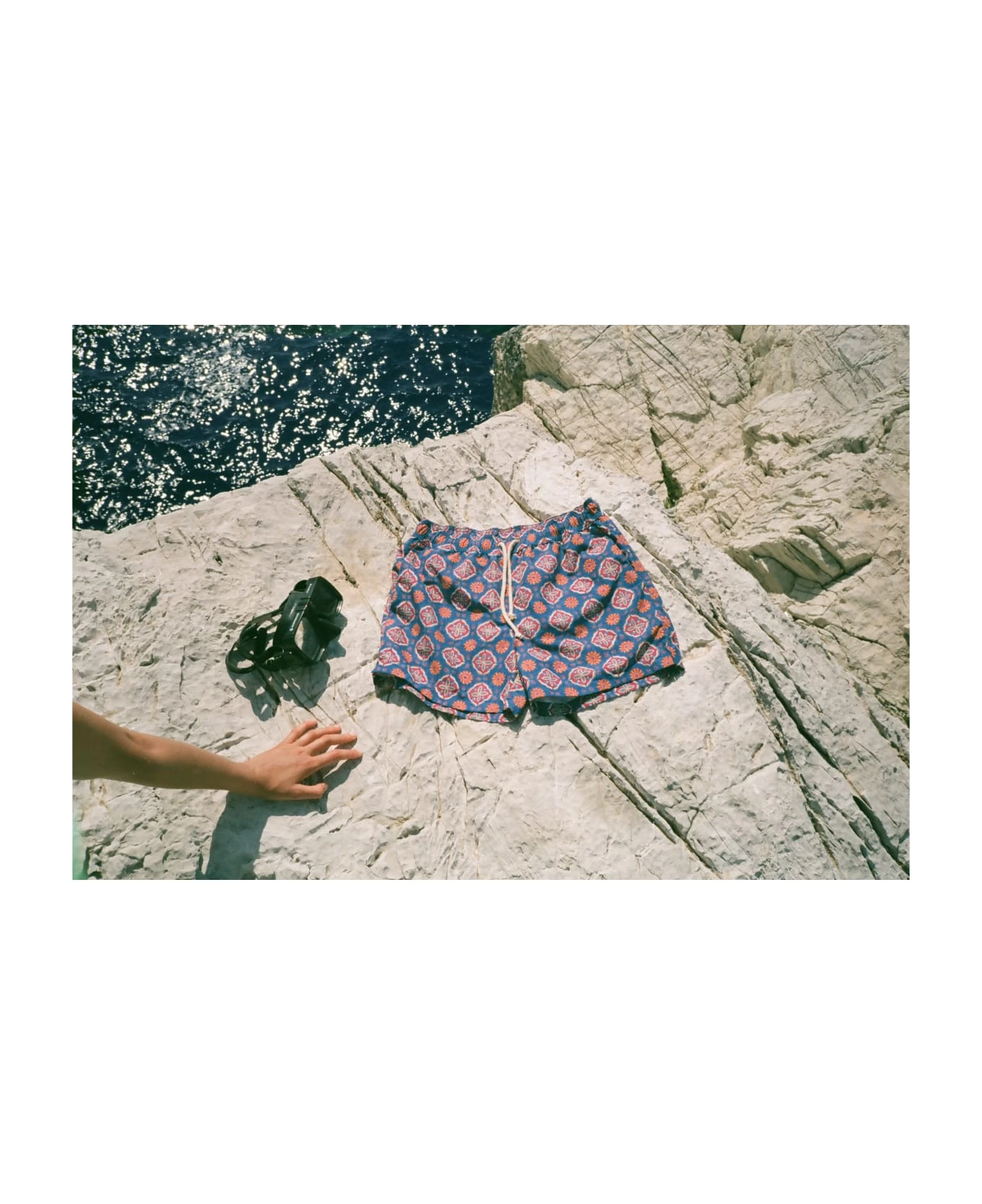The classic swim shorts were redesigned for a more elegant, tailored look and a comfortable fit. Made from soft, brushed fabric that is quick-drying and has a distinctive cotton-feel. Tying-cord made from braided nautical rope in unbleached cotton. Pattern drawn by hand. Made in Italy.