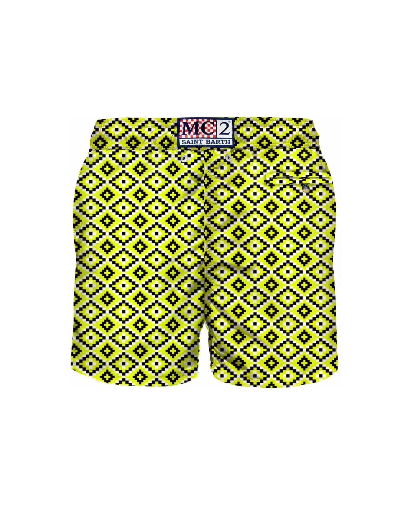 Man’s Slim-Fit Swim Short, vintage style, Atzeco printed, soft-touch Yellow Fluo fabric, quick drying, mid-lenght, light net lining, elasticated waistband, drawstring fastening, front and back pocket with button. CARE INSTRUCTIONSCold wash by running water and neutral soap. Hang to dry.