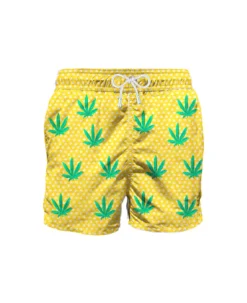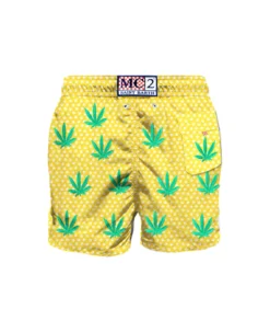 Discover the MC2 Saint Barth spring summer men’s collection! A lot of funny and colored print are waiting for you, for your amazing holidays! Green leaves declined in the embroidered version, on yellow backcloth. Mid-lenght swim short, regular fit, microfiber fabric, drawcord closure, inside ergonomic brief, pockets on both sides, backside classic pocket with velcro closure. CARE INSTRUCTIONS