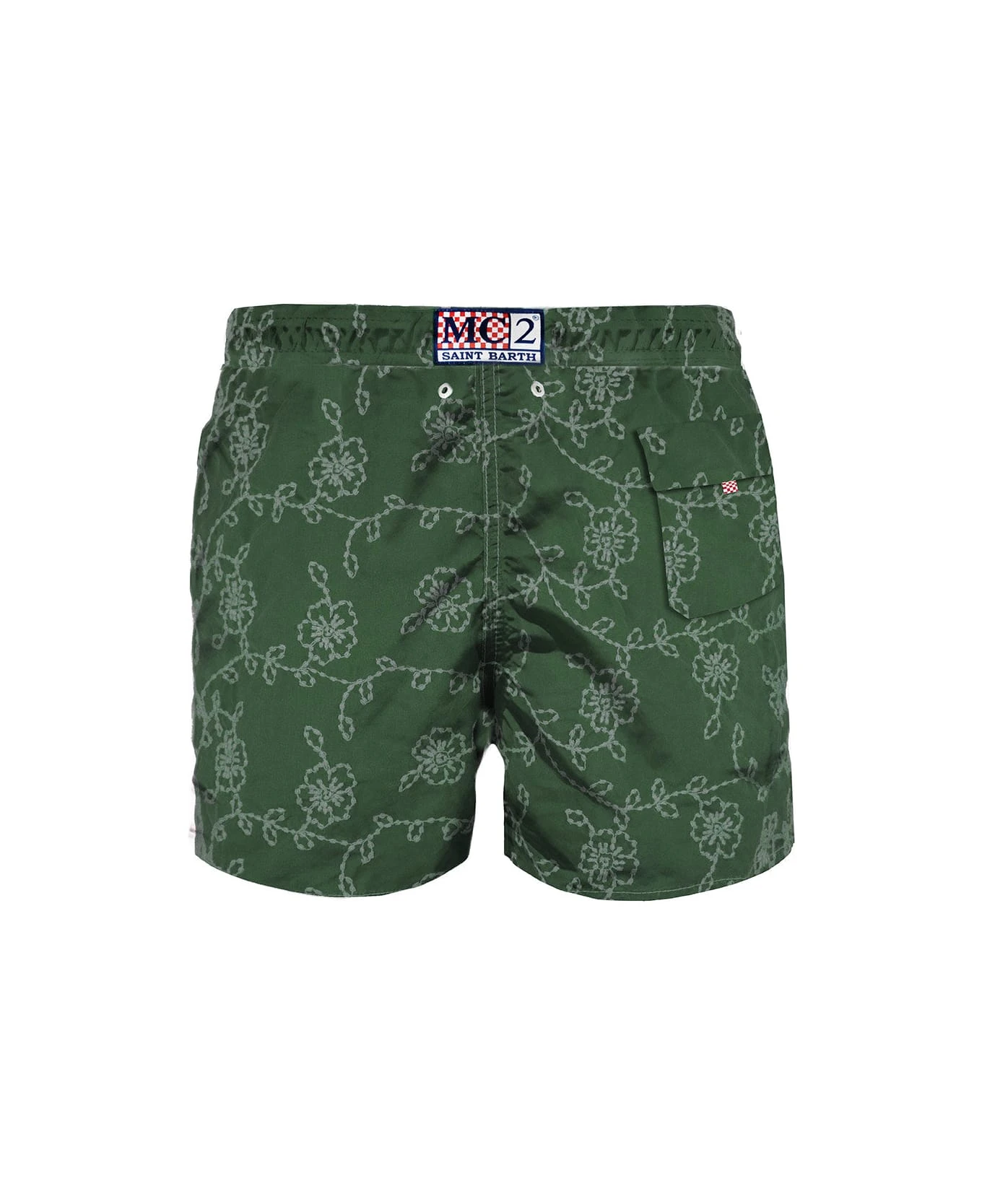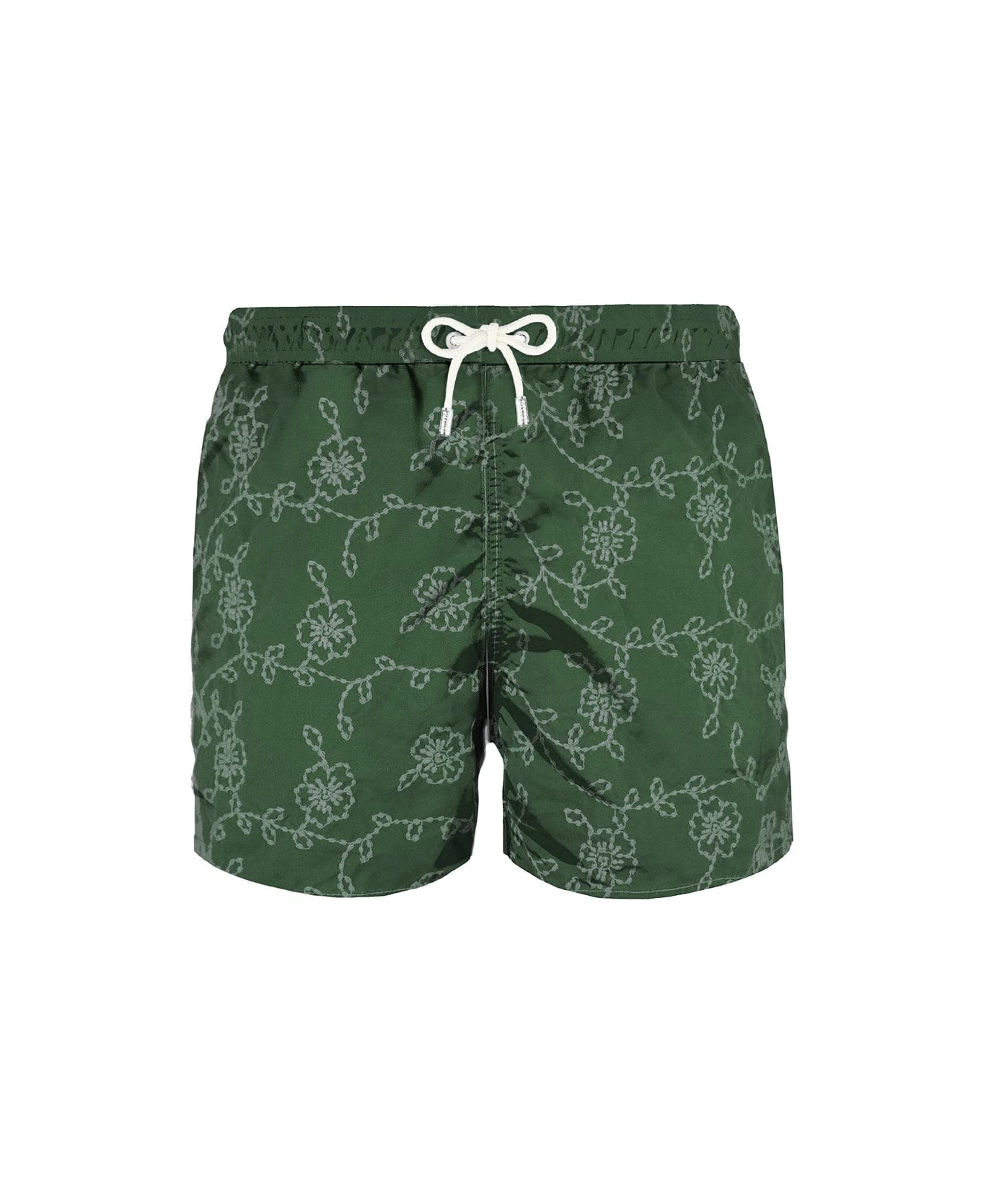 Embroidered flower swim shorts, mid-length, regular fit, green microfiber, comfortable drawstring waist, inside ergonomic brief, pockets on both sides, backside classic pocket with velcro closure.