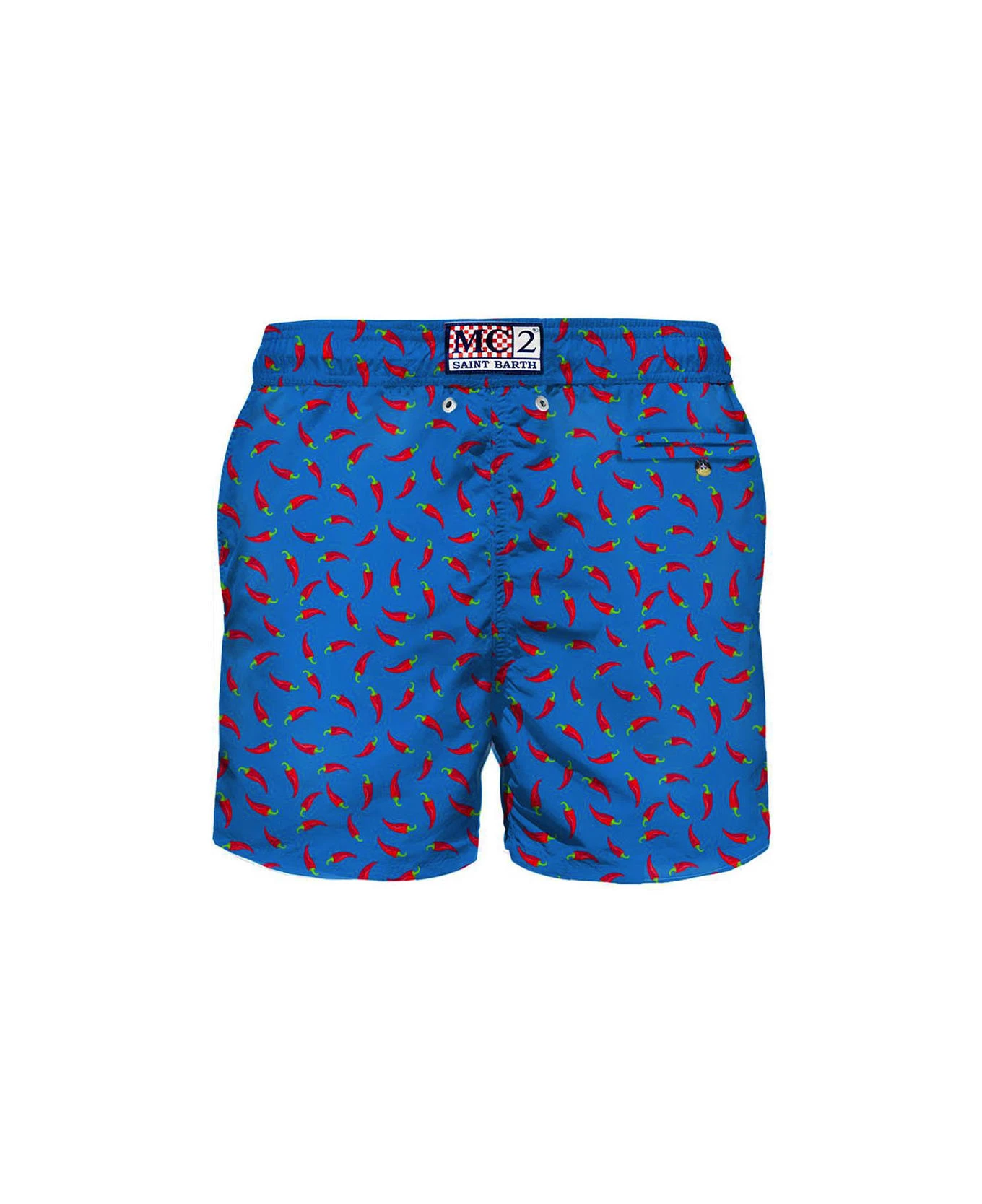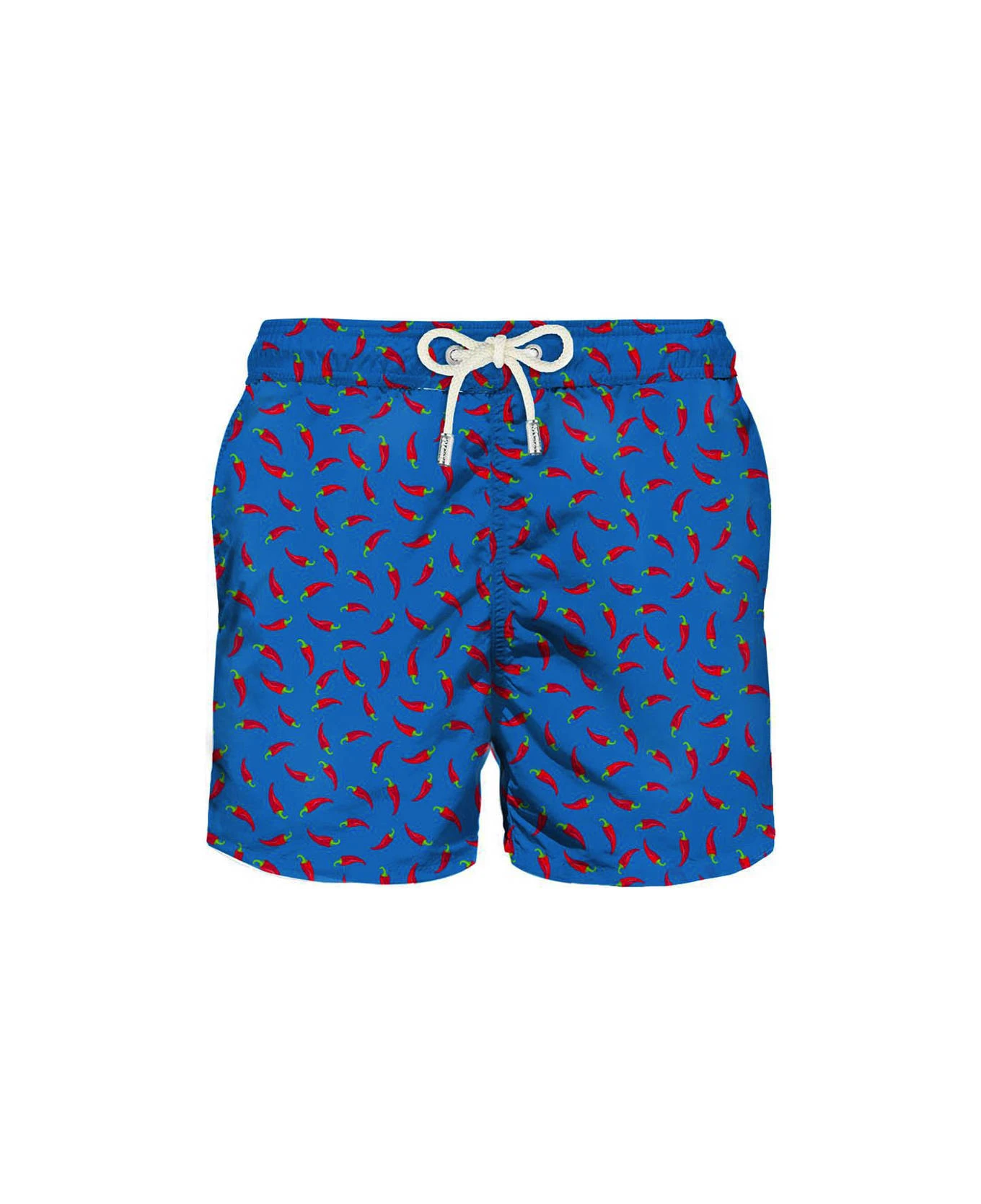 MC2 Saint Barth man’s swim shorts, micro chili peppers all over print on bluette backcloth, light fabric, quick drying, mid-lenght, light net lining, elasticated waistband, drawstring fastening, front and back pocket with button. CARE INSTRUCTIONSCold wash with water and neutral soap. Do not leave to soak. Dry the unfolded garment. Do not dry in contact with other clothes.