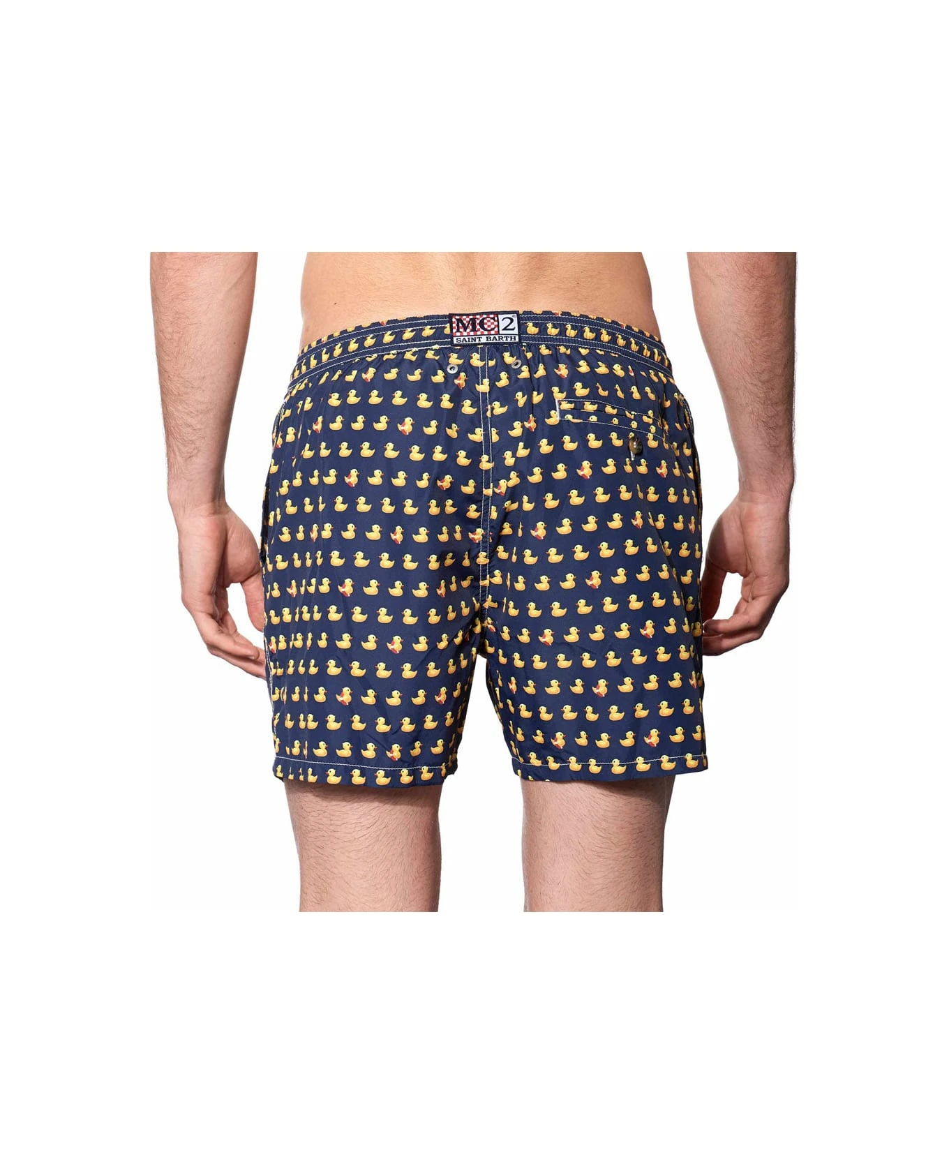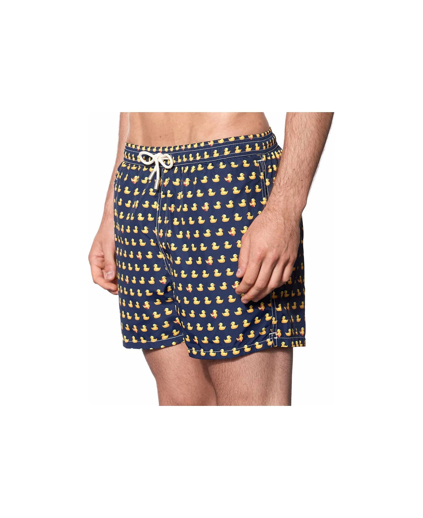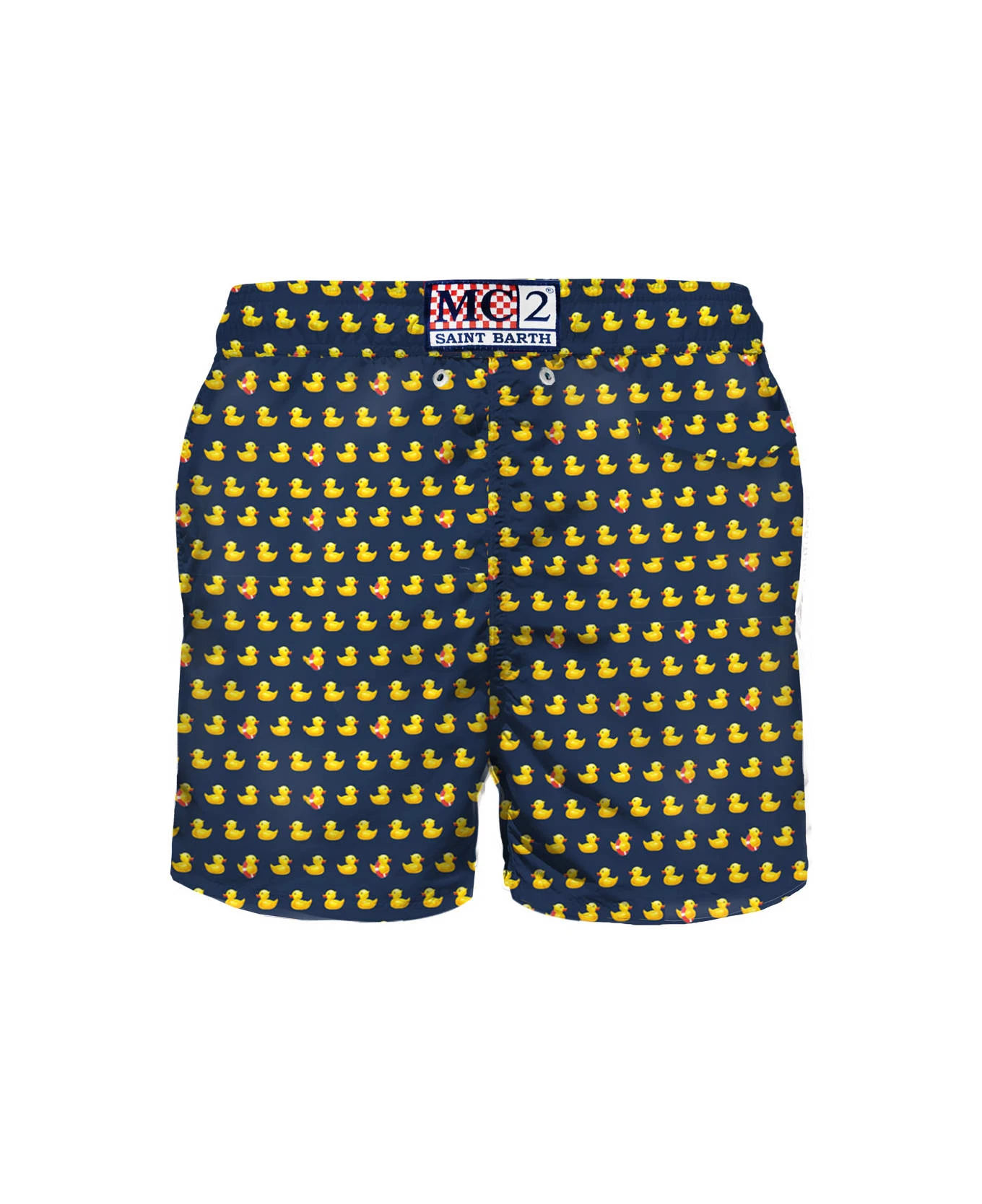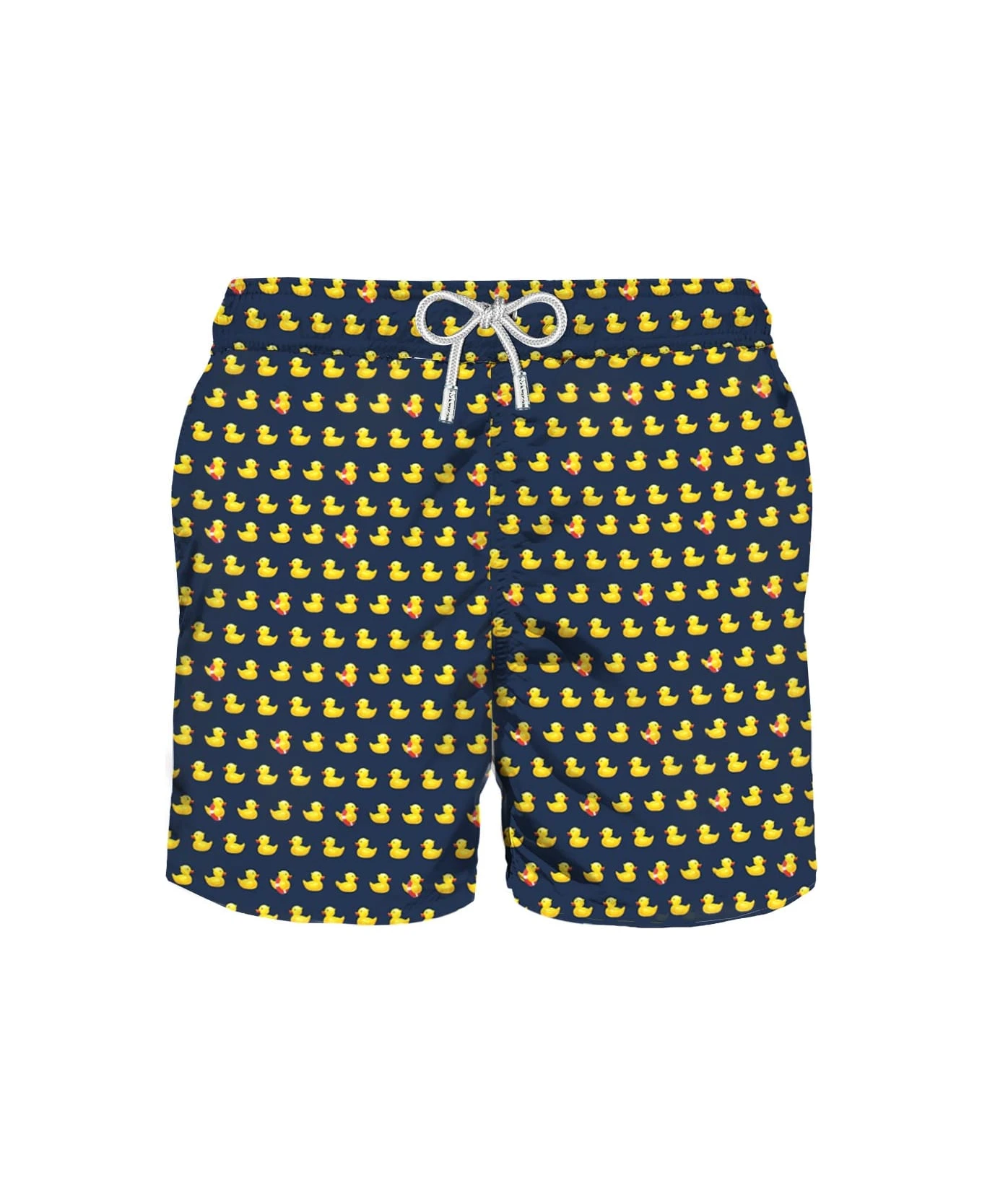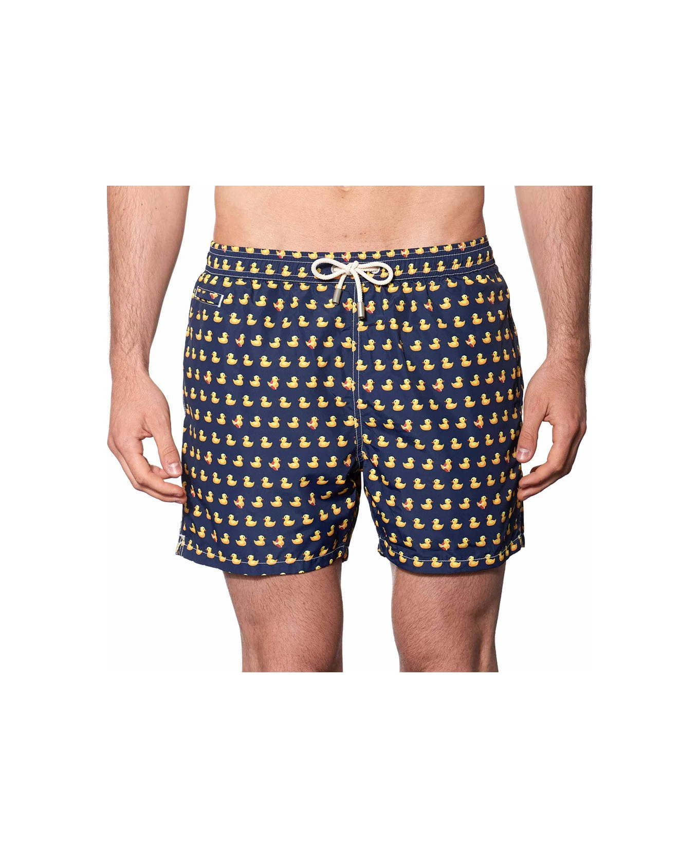 Ultraweight Swim Trunk, yellow rubber ducky all over print, Quick Drying, blue navy microfiber, mid-lenght, regular fit, inside ergonomic brief, drawcord closure, backside pocket with magnetic closure. The swim trunk can be folded into the back pocket turning into a perfect travel pouch. CARE INSTRUCTIONS