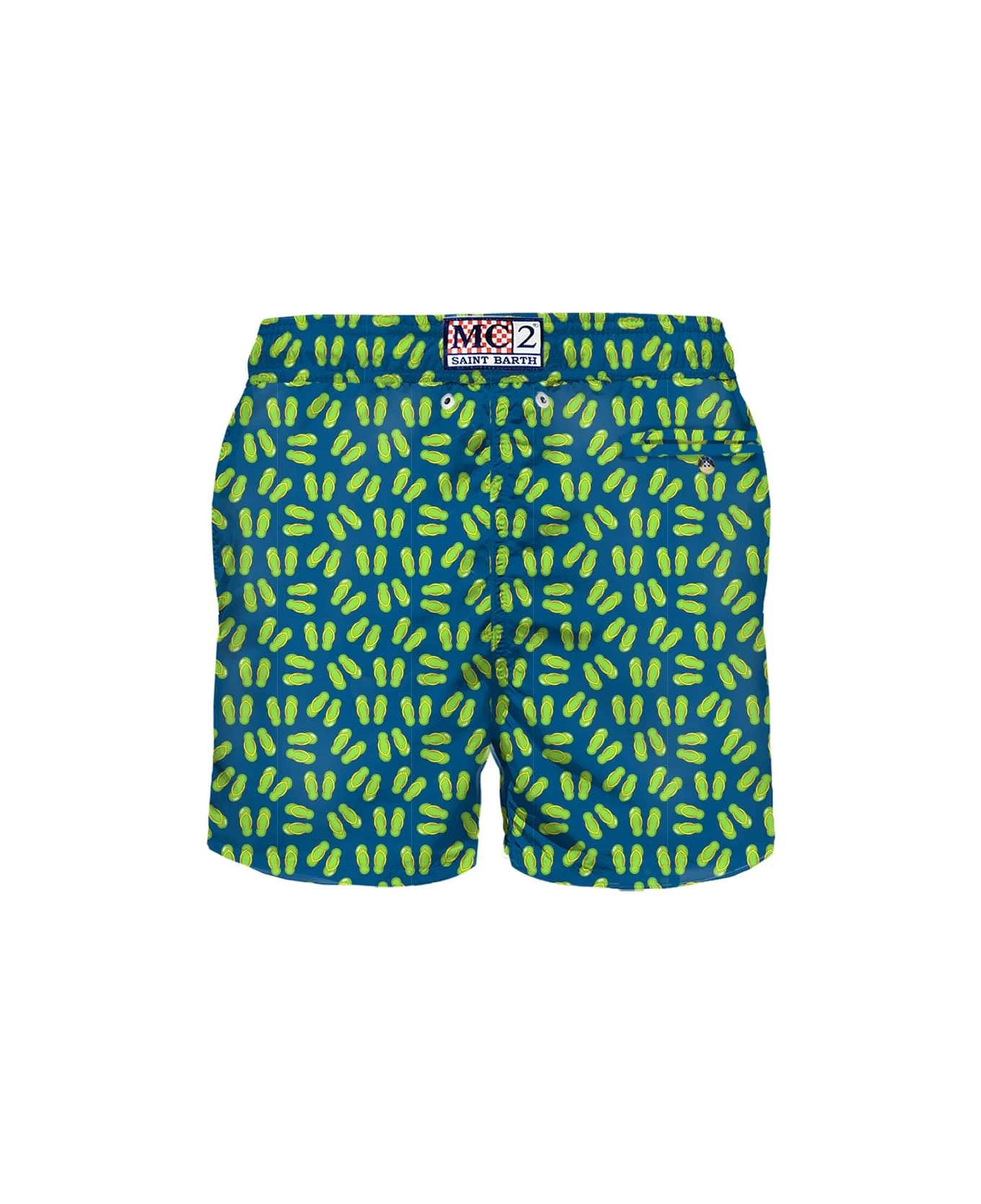 Man’s classic blue swim short, mini flip flop print, light fabric, quick drying, mid-lenght, light net lining, elasticated waistband, drawstring fastening, front and back pocket with button.