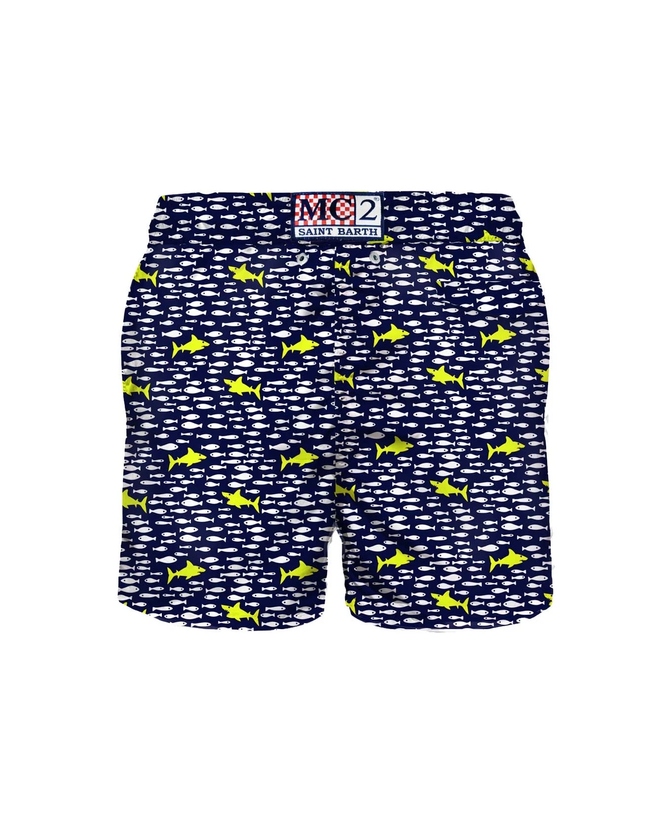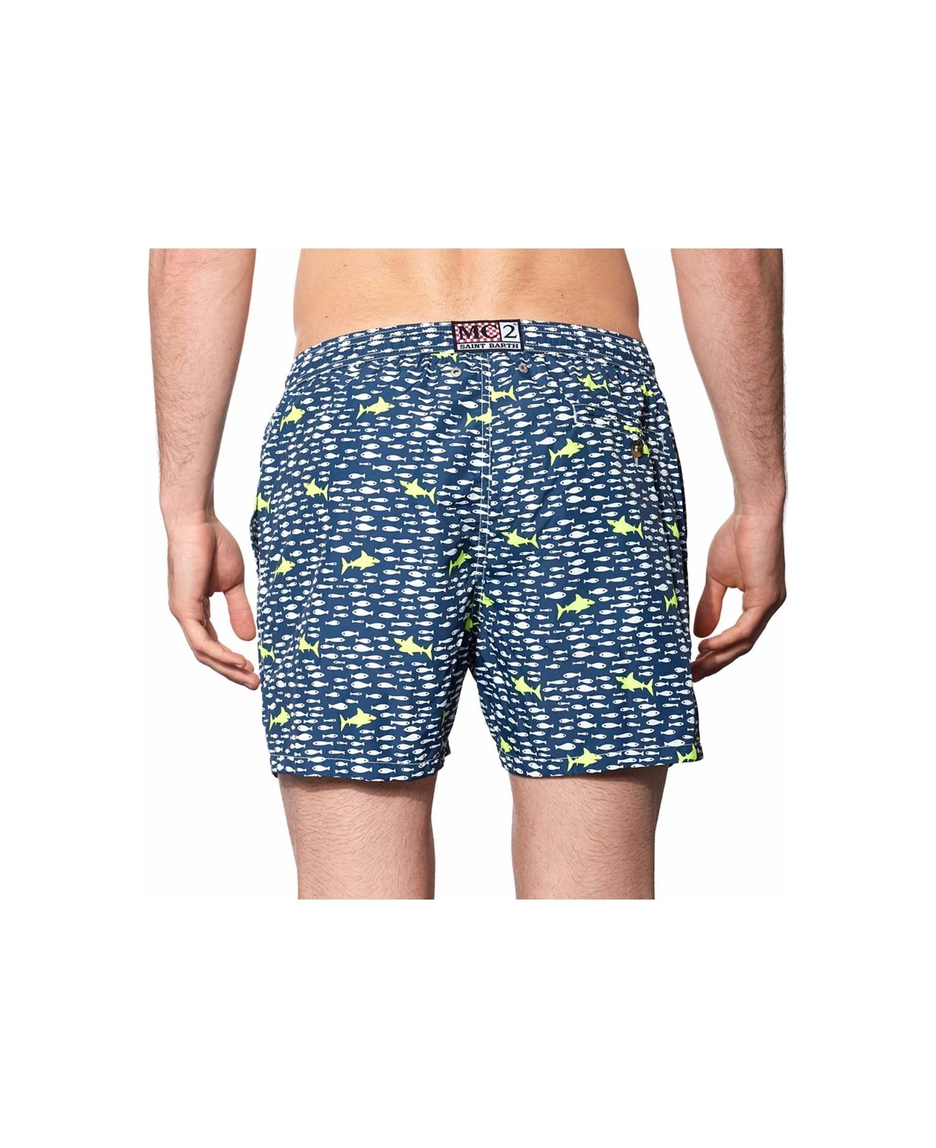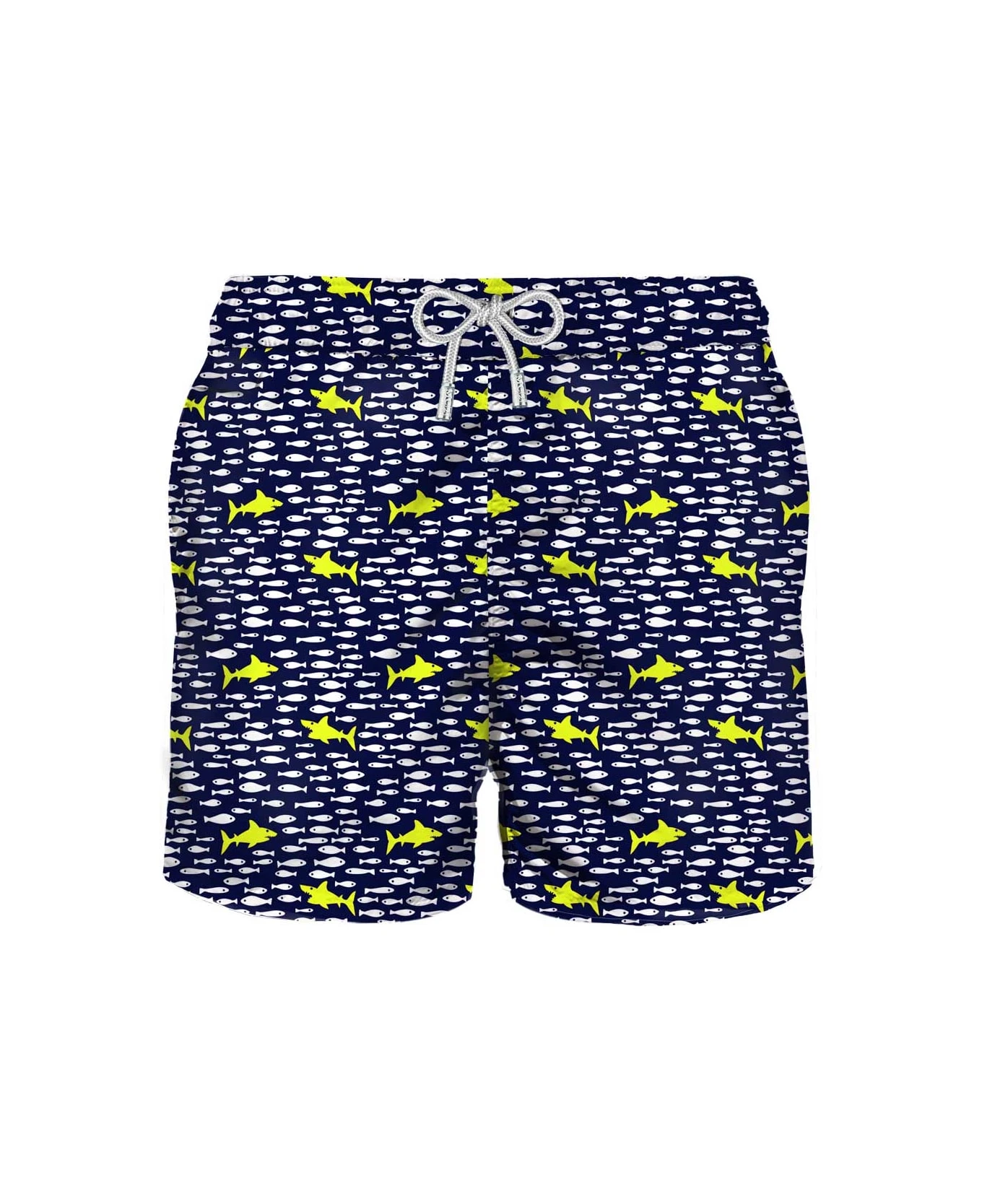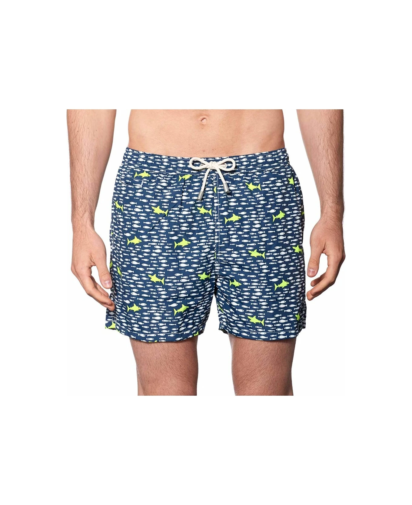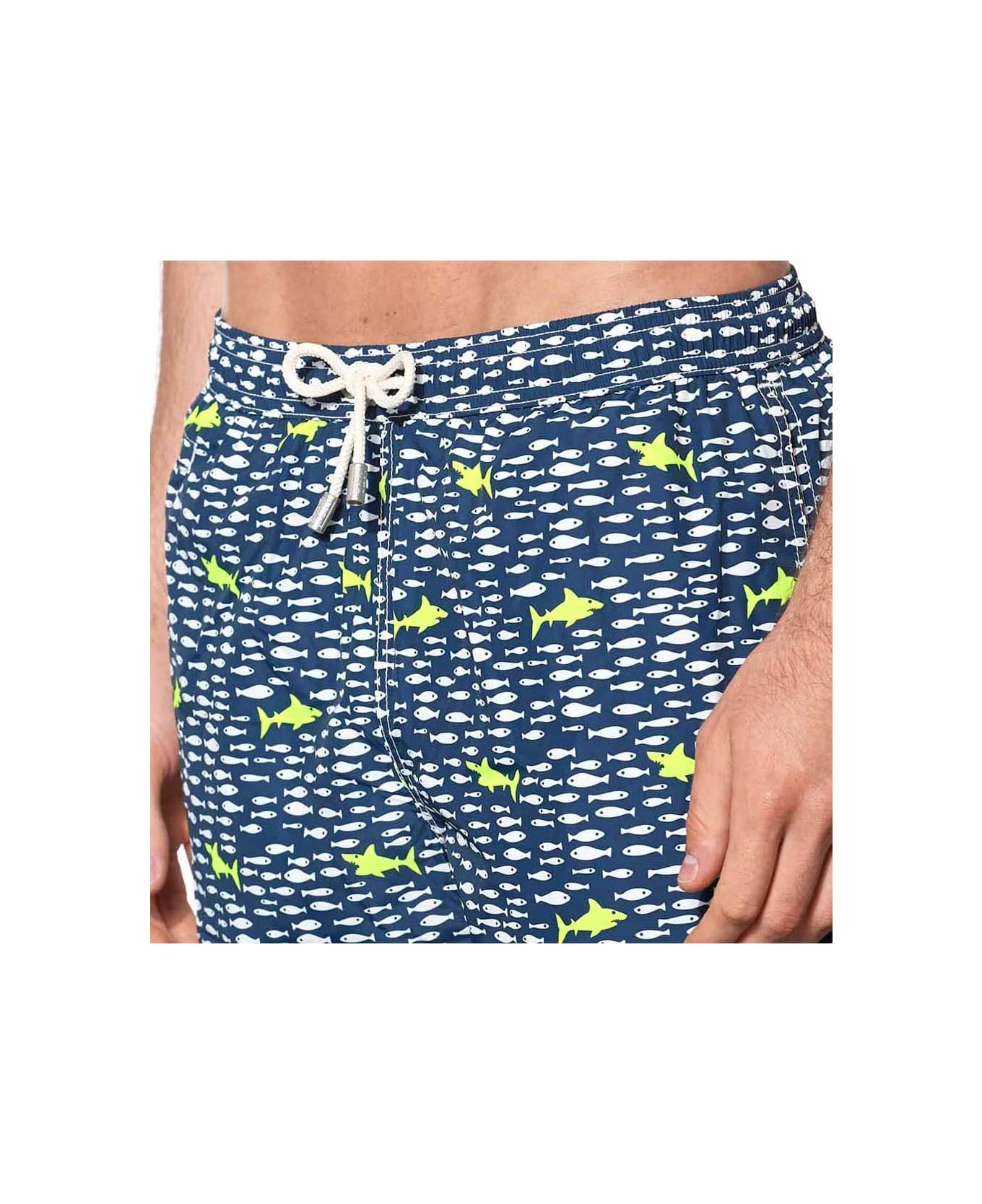 Discover the MC2 Saint Barth spring summer men’s collection! A lot of funny and colored print are waiting for you and your amazing holidays and summer! MC2 Saint Barth man’s classic swim short,white and yellow fluo,micro sharks,all over print on blue backcloth, light fabric, quick drying, mid-lenght, light net lining, elasticated waistband, drawstring fastening, front and back pocket with button. CARE INSTRUCTIONS