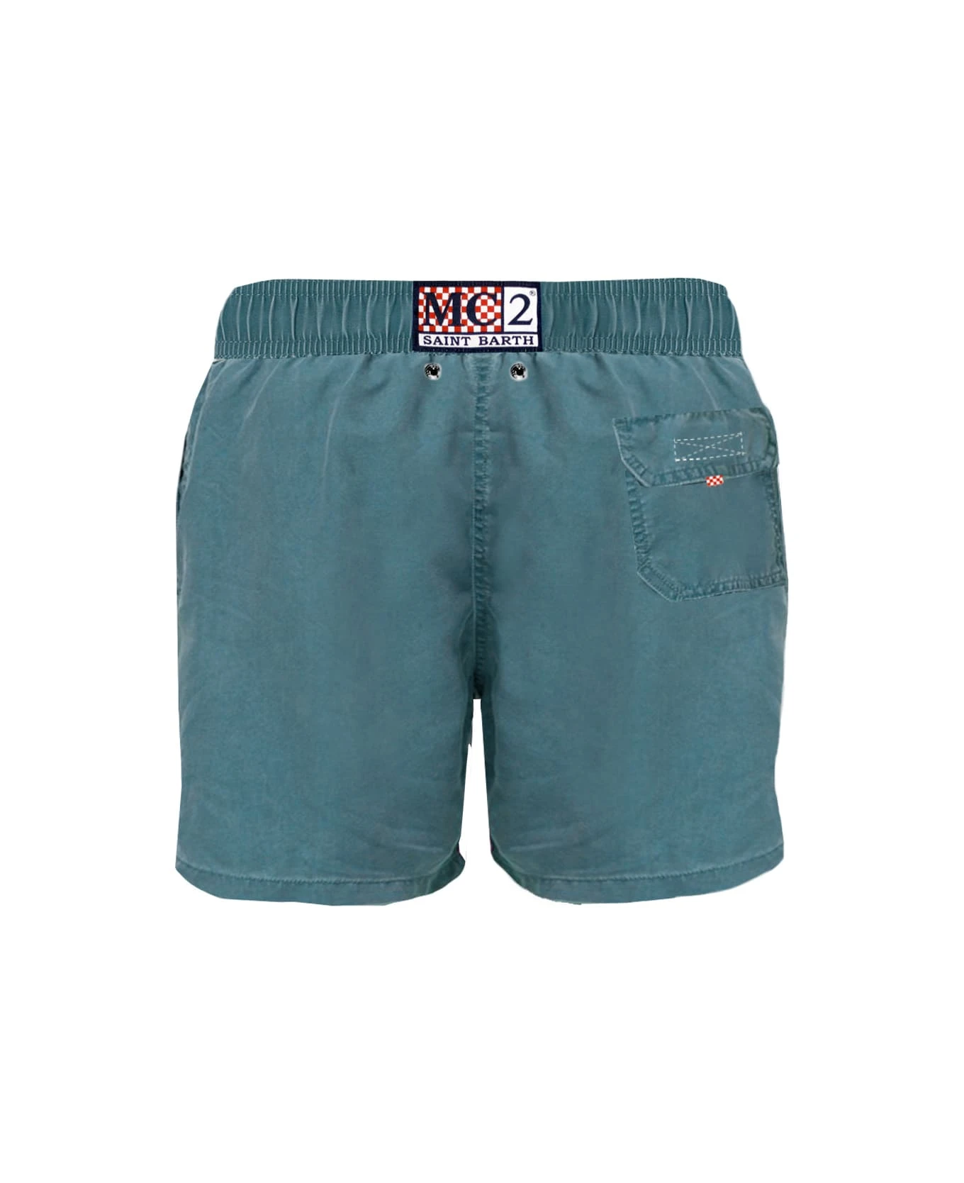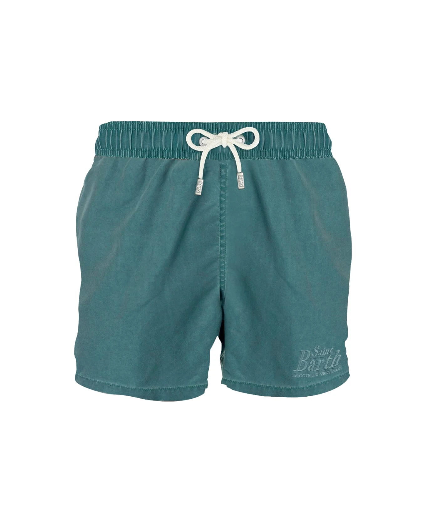 Men’s Swim Shorts mid-lenght,blue petroleum microfibre, St. Barth front embroidered, regular fit, velvety hand feel fabric, comfortable drawstring waist, inside ergonomic brief, backside classic pocket with velcro closure. CARE INSTRUCTIONS