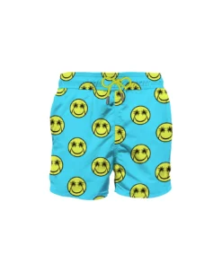 Mens Swim Shorts mid-lenght, torquoise with palm smile print, regular fit, microfiber, inside ergonomic brief, pockets on both sides, drawcord closure, backside classic pocket with velcro closure.