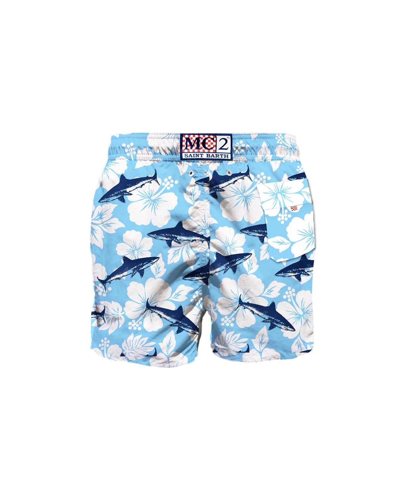 Discover the spring summer men’s collection! A lot of funny and colored print are waiting for you, for your amazing holidays! White hibiscus print on light blue backcloth, dark blue velvet sharks pattern, mid-length swim short, regular fit, microfiber fabric, drawcord closure, inside ergonomic brief, pockets on both sides, backside classic pocket with velcro closure. CARE INSTRUCTIONS