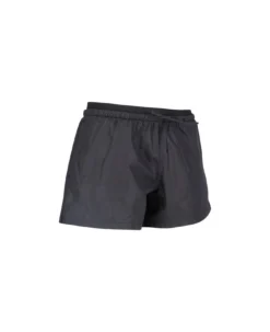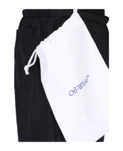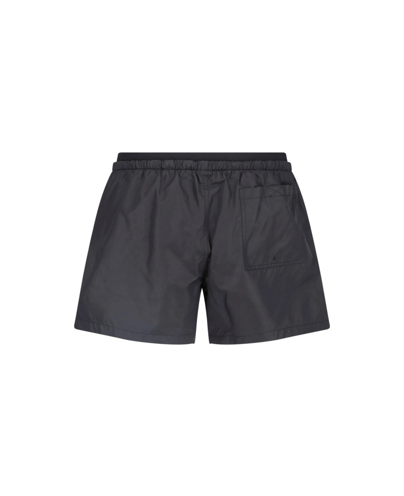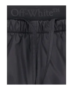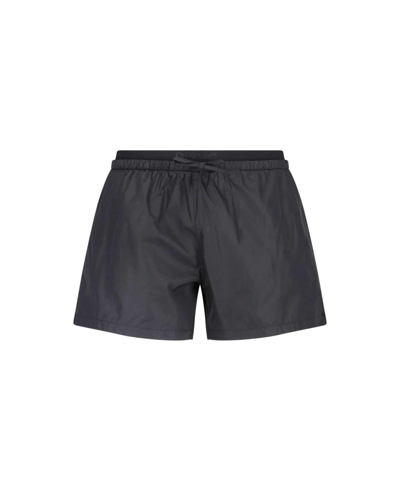 Off-White logo swim shorts in black fabric with elastic waistband with tone-on-tone logo detail, drawstring, two side pockets, and one back pocket.