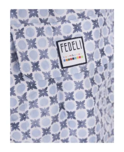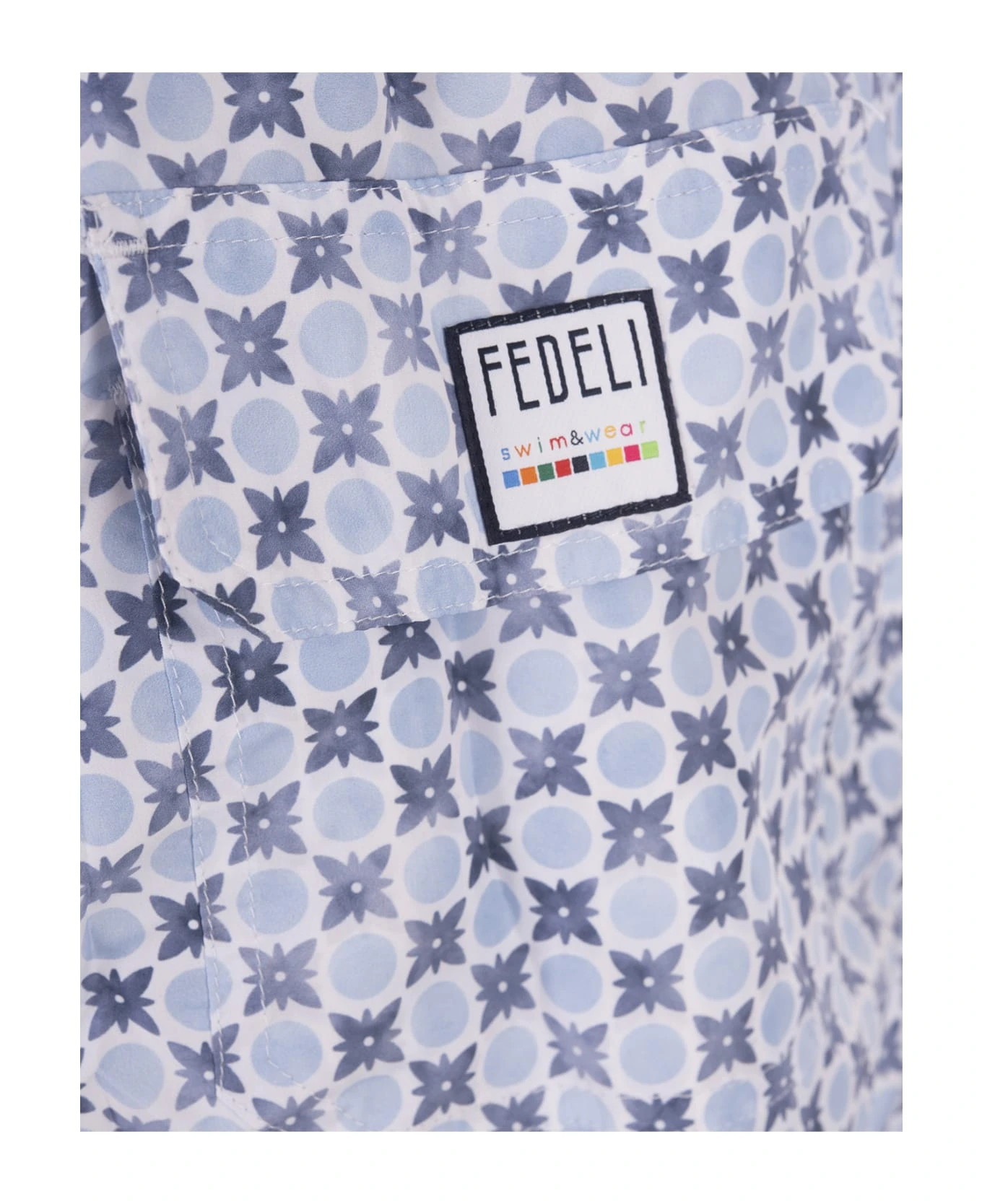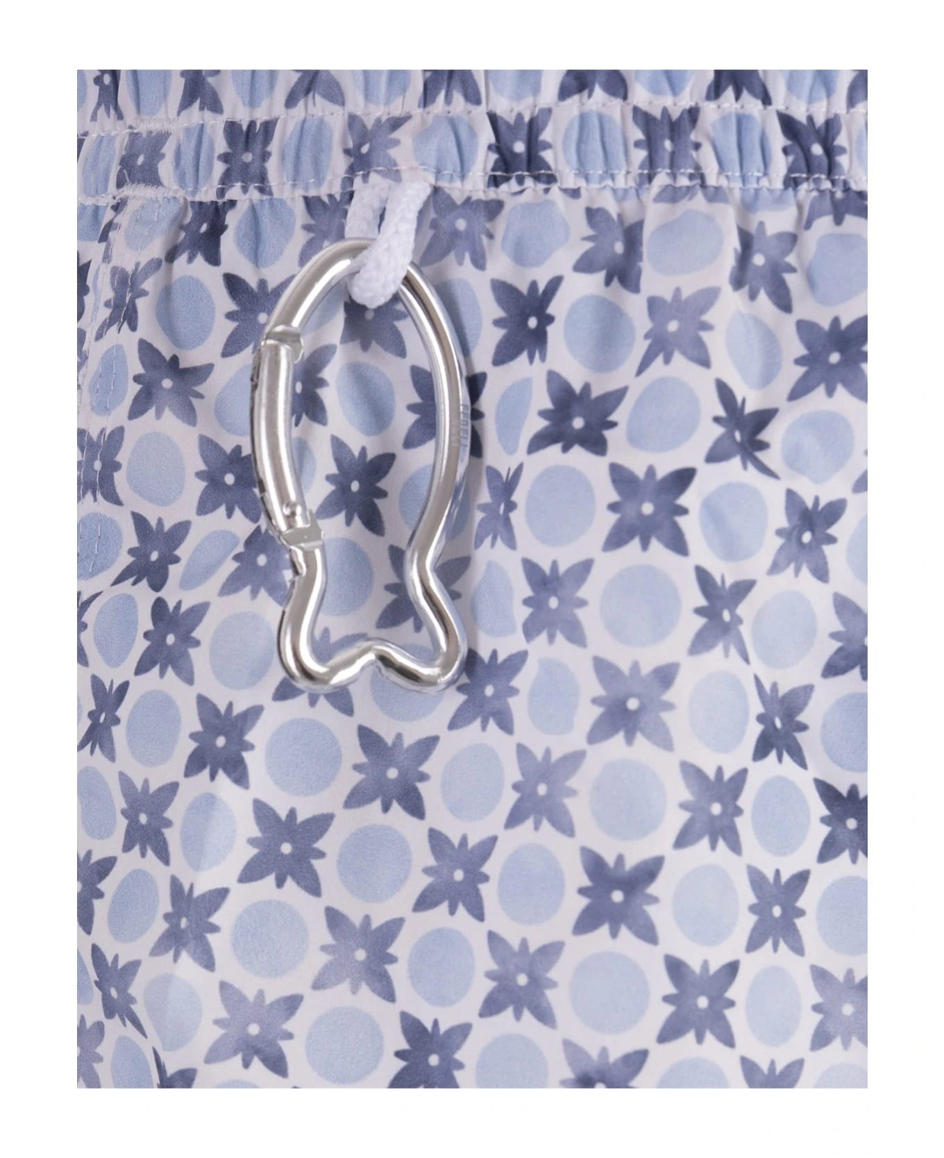 Fedeli swim shorts made of white technical fabric with blue all-over pattern of flowers and polka dots. The garment features an elasticated waistband with drawstring, side slash pockets, metal snap hook and a back pocket with flap and logo patch.